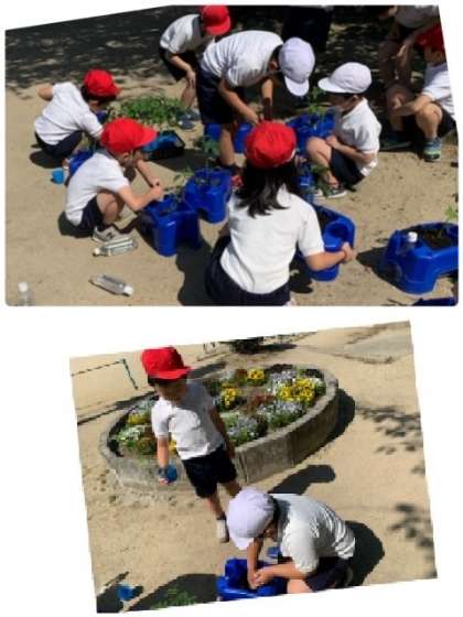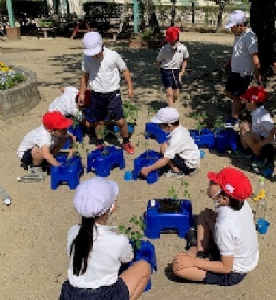 2年1組の生活の時間です。「ミニトマト」の苗植えをしました。最初に半分くらいまで土を入れてもらったところで、それぞれが自分の植木鉢に苗を植えていきました。保育所や幼稚園で経験がある児童が、困っているお友だちのお手伝いもしてくれていて感心しました。苗を植えたら、さらに土を足してもらって、水やりをしました。うれしそうな表情で水やりをしている姿も、とても印象的でした。これからお世話をしっかりして、成長を見守ります!