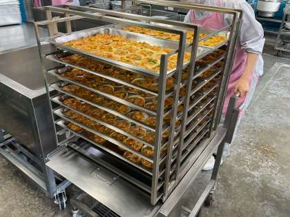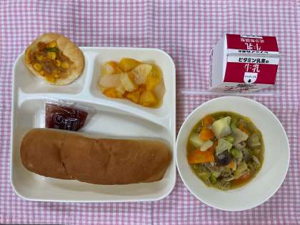 今日の給食は「コッペパン、豚肉と野菜のカレースープ煮、変わりピザ、ミックスフルーツ(缶)、いちごジャム、牛乳」でした。毎回大好評の変わりピザは、ぎょうざの皮にツナ、チーズ、ピーマンを合わせてピザソースをからめた具をのせて焼きます。ひとつひとつが手作業なので、とても手間がかかります。その分とてもおいしい仕上がりです。「もっと食べたい!」「また作って!」次の登場をお楽しみにしてくださいね。