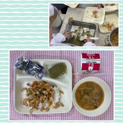 今日の給食は「かやくご飯、みそ汁、まっ茶ういろう、牛乳」でした。かやくご飯は、自分たちで具を混ぜて食べます。なので、具は少し味は濃いめです。デザートのまっ茶ういろうは、上新粉、砂糖、まっ茶、白いんげんのペーストを混ぜて、蒸して作ります。お茶の緑がとてもきれいでした。「なかなか家で手作りはしないなぁ」と先生方からの声。おいしいですが、もちもちして配膳するのが大変です。当番の人はがんばってくれました。