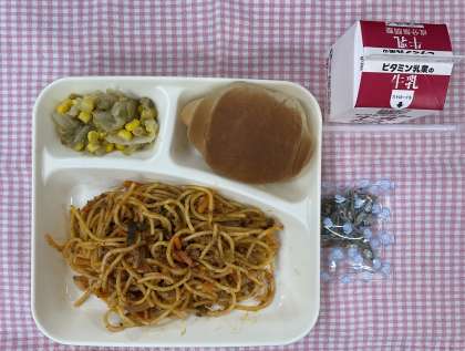 今日の給食は「黒糖ロールパン、ミートソーススパゲッティ、レタスとコーンのサラダ、ミニフィッシュ、牛乳」でした。大人気メニューです。レタスは蒸していますが、食感はよく、おいしく食べることができました。放課後に、先生から「スパゲッティはおいしかったけど、サラダのコーンをおはしで食べるのは大変だった」という話を聞いて、確かにそうだなぁと。残食も少なく、しっかり食べてくれていましたが、特に低学年の子たちはがんばってくれていたのかもしれません。