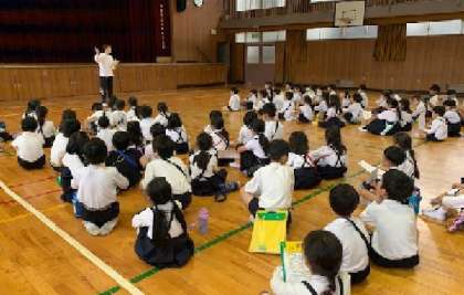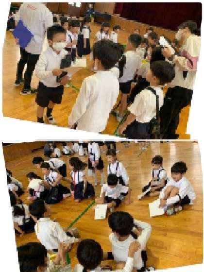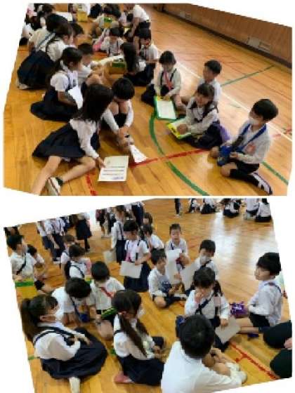 5月23日(火)、「学校探検」をしました。2年生が1年生を案内してくれます。まずは講堂に集まり、グループで自己紹介しました。