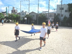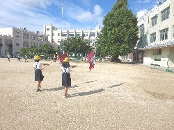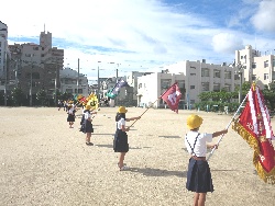 代表の児童が、優勝旗・準優勝盾や学年の旗をもって入場します。
