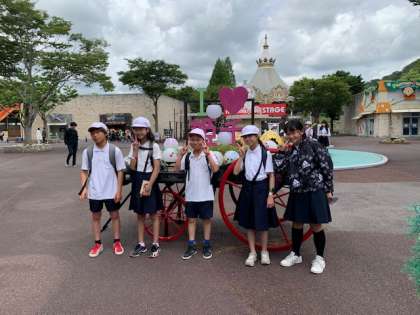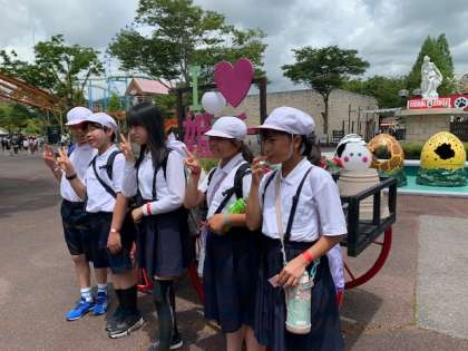 お弁当を食べ終わった班から、写真を撮って…。ここから班活動で、遊園地を楽しみます。