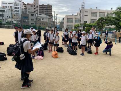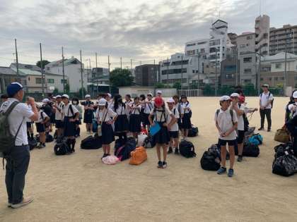 6年生が.学校に戻ってきました。帰校式をしています。お土産話がたくさんあると思います。