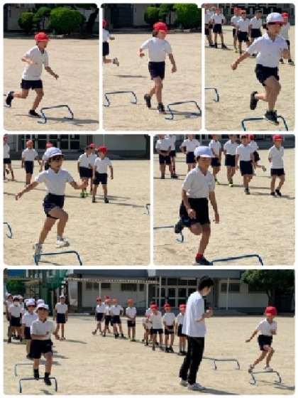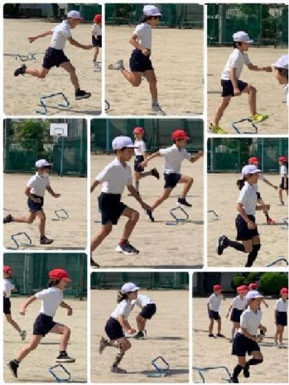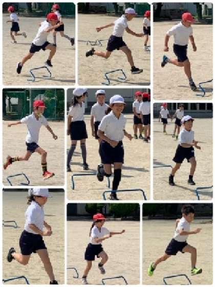 3年2組の体育の時間です。今日は、ミニハードルを使った運動をしました。みんな、がんばっています!