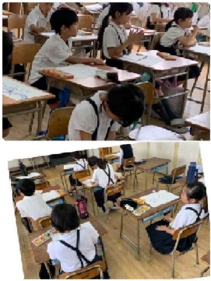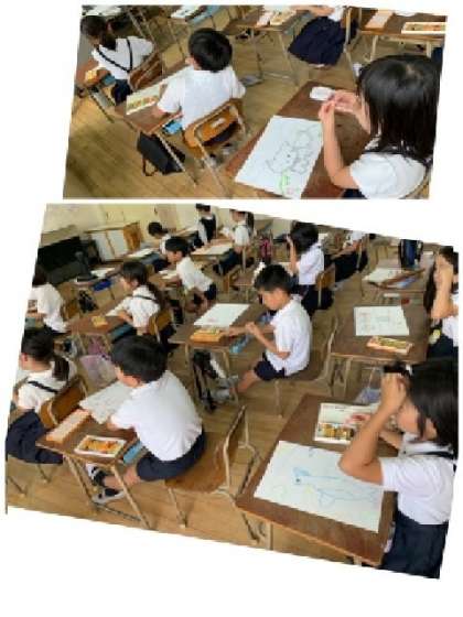 3年2組の図工の時間です。自分の好きな生き物の絵を描いています。身近な鳥や動物、あるいは海の生き物など、それぞれが考えて描いています。出来上がりが楽しみです!