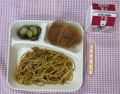 12日の給食は「黒糖ロールパン、カレースパゲッティ、きゅうりのピクルス、棒チーズ、牛乳」でした。カレースパゲッティは、カレールウの素を加える前にカレー粉を加えて炒めて風味アップしています。きゅうりはワインビネガーを使ってこちらも風味よくさっぱり。棒チーズは、子どもたちにも好評でした。給食では久しぶりの登場で、初めての子もたくさん。「どうやって開けるの?」「ちぎる?」など開け方も難しかった様子。まわりから「ここに開けるところのマークついてるよ」「めくれるよ」とアドバイスしてくれる子もいました。食べる時には「チーズはパンにはさみたい」「カレースパゲッティにちぎって混ぜたい」「そのままが好き」と食べ方についてもいろいろなアイデアが。いろいろな食べ方を楽しんだようです。
