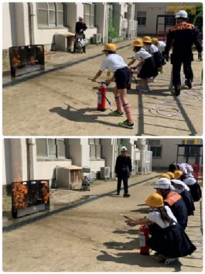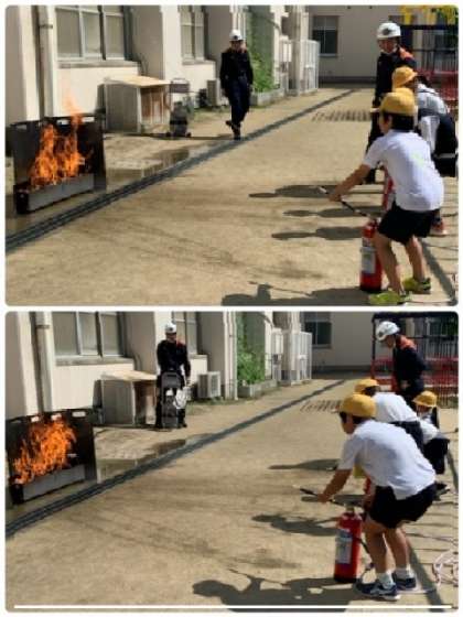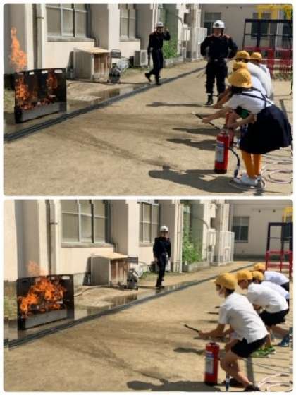 3・4年生対象に、「水消火器」による消火訓練を体験させていただきました。