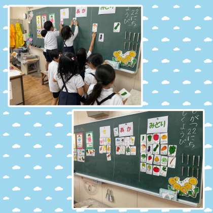 今日は1年生で栄養指導を行いました。食べ物は黄赤緑の3つの色のグループに分けることができ、その3つの色の食べ物をバランスよく食べることが元気につながることを学習しました。一人1枚もらった食べ物カードを色分けする時は、よく考えて黒板に貼ることができました。給食時間には、担任の先生が「パンは何色のなかまだった?」と聞くと「黄色!」「赤の食べ物はなにが入ってる?」「牛乳!」「お肉!」「緑は?」「キャベツ!たまねぎもある〜」などとしっかり答えてくれました。給食には3つの色の食べ物がきちんと入っています。なんでも食べて、暑くなっても元気に過ごしたいですね。
