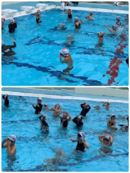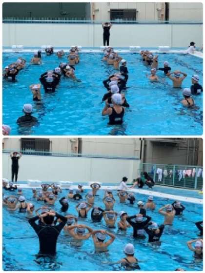 6月26日(月)、今日から「水泳学習」が始まります。初日の今日は、まずは中学年の授業から・・。最初に、並び方や入水する際のハンドサインなどの再確認をしました。そして、水に慣れる活動です。頭まで水につけて・・次は、プールの底にタッチしました。