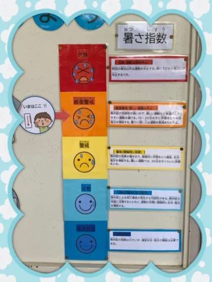 また、その横には、「暑さ指数」を示しています。児童たちには、その日の暑さ指数をみて、「熱中症対策」を心がけるよう、声かけもしていきたいです。