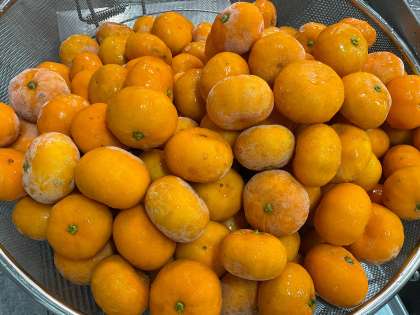 今日の給食は「ごはん、鶏肉と野菜の煮もの、ひじき豆、冷凍みかん、牛乳」でした。ひじき豆は、朝から大豆をお湯につけ、柔らかくしておきます。それにでんぷんをまぶして油で揚げ、ひじきの入ったたれをからませて仕上げました。少し甘辛くかみごたえのある献立で、いつも好評です。そして今日は、冷凍みかんの登場です!今日はかなり暑かったので、冷凍みかんも大好評。表面はだいぶ溶けていたのですが、中はひんやり。「しみる〜」という声もちらほら。冷凍みかんは8月にもう一度登場する予定です。