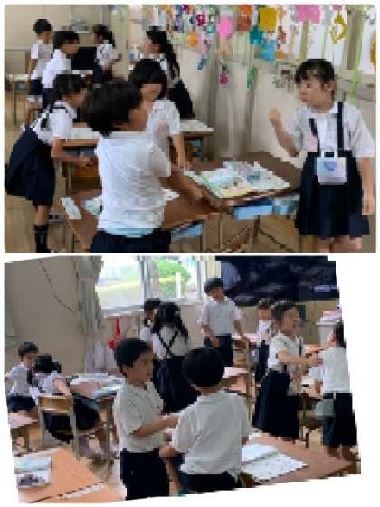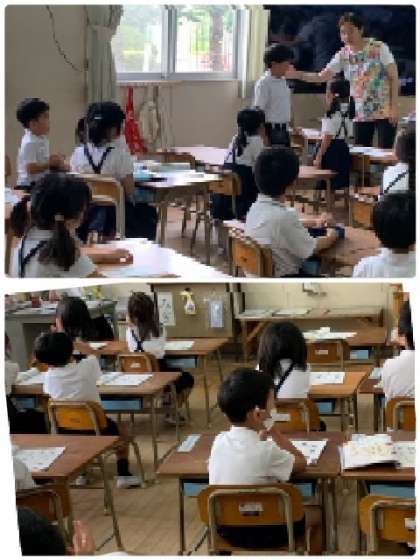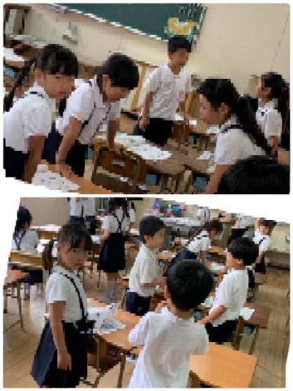1年1組の音楽の時間です。身近な音を見つけていきました。例えば、お茶を飲む「ごくごく」、テープの「ピリピリ」など・・・。見つけた音を、ペアで互いに「かけあい」で表現しています。