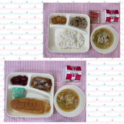 10日は「コッペパン、なすのミートグラタン、スープ、ダイスゼリー(ぶどう)、りんごジャム、牛乳」でした。ミートグラタンは、なすも食べやすく好評!そしてゼリーも好評でしたが、高学年からは「おいしかったんだけど、ちょっと甘くて苦手かな〜」という声も。この2日間で苦いと甘い、どちらも登場しました。