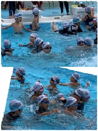 水泳学習の最終日となるので、最後は、みんなが楽しめる「宝物探し」をしました。プールの中に沈んでいるキューブを見つけて集めていきます。2チームの対抗戦ですが、とても楽しんでいました。活動の最後には、楽しませてくれたプールに「ありがとうございました!」を伝えて、今年の水泳学習が終了しました。