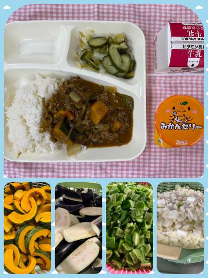 今日の給食は「夏野菜のカレーライス、キャベツときゅうりのサラダ、みかんゼリー、牛乳」でした。1学期最後の給食がカレーライスなので、みんな大喜びです。なすやピーマン、かぼちゃなどの夏野菜がたっぷり入っていましたが、食べやすく仕上がっていました。今日はデザートにゼリーもついていたので、みんなどんどん食べることができました。