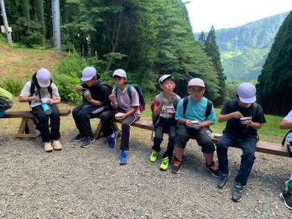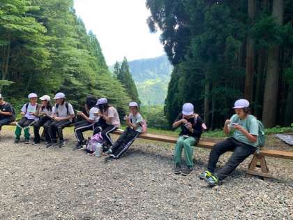 勾玉作りを終え、おやつのアイスクリームを食べています。