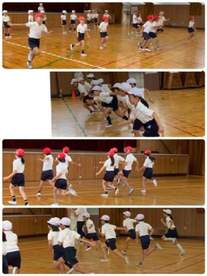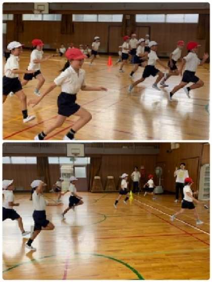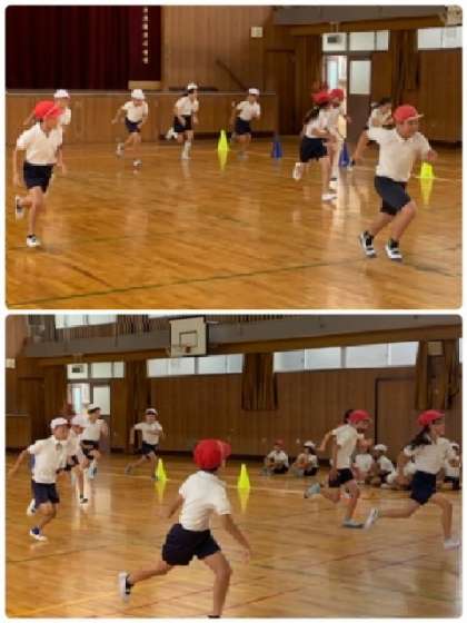 先生が指示する距離を走ります。まずは、そのまま前を向いてダッシュ。続いて、後ろ向きに・・。次に、2人ペアになって「変わりおにごっこ」。一人が逃げて、一人が追いかけます。出発点は、鬼役の人が決めます。いくつかのコーンの位置から選びました。結構、最初は強気で決めたのに・・追いつくのは、やっぱり大変。2回目は、うまく考えて設定していました。