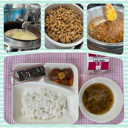 1日の給食は「ごはん、酢豚、中華みそスープ、焼きのり、牛乳」でした。酢豚にはからりと揚がった大きめの豚肉が入っていてボリュームがありました!大好評です。