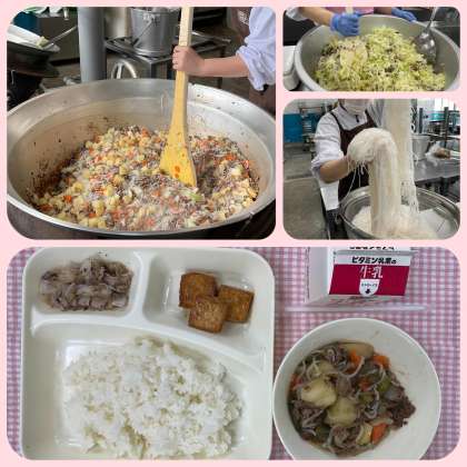 4日は「ごはん、肉じゃが、あつあげのみそだれかけ、キャベツの赤じそあえ、牛乳」でした。肉じゃがはじゃがいもがホクホクして優しい仕上がり。キャベツはみんなに人気の赤じそあえです。色もきれいで味もさっぱりとして毎回好評です。