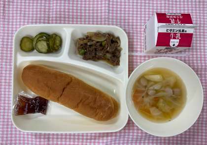 5日の給食は「コッペパン、牛肉のデミグラスソース煮、スープ、きゅうりのピクルス、いちごジャム、牛乳」でした。牛肉のデミグラスソース煮の味付けにはケチャップやソースも使い、子どもに人気のある味に仕上がりました。教室に行くと、ジャムよりもこの肉を挟んでいる子がたくさんいました。「パンにはさむとおいしいわぁ」「ちょっとだけパンを残して、それにジャムつけるわ。お肉をパンにはさみたいから」などなど。みんなで楽しそうにはさみながら食べていました。