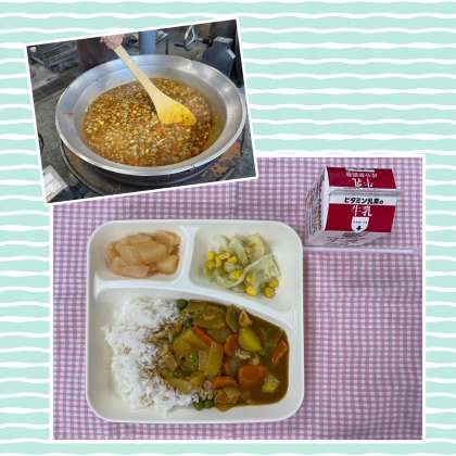 今日の給食は「チキンカレーライス(米粉)、キャベツとコーンのサラダ、白桃(カット缶)、牛乳」でした。チキンカレーライスは、ややあっさりした仕上がりになるのですが、カレールウの素のほかにもチキンブイヨンやりんごピューレなども加えてうまみのあるカレーライスに仕上げました。デザートには白桃の缶詰もあり、おいしくいただきました!
