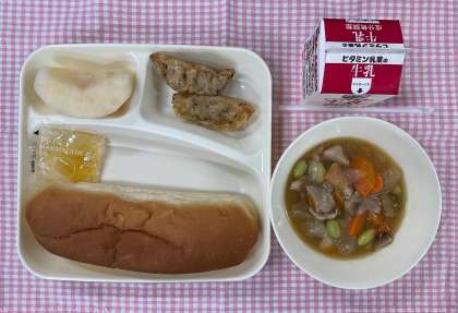 22日の給食は「コッペパン、あげぎょうざ、鶏肉ととうがんの中華煮、なし(二十世紀)、マーマレード、牛乳」でした。あげぎょうざは1人2個。おいしく揚がっていました。デザートには旬のなしが登場です。今回は二十世紀です。ややかための食感で甘みもありました。