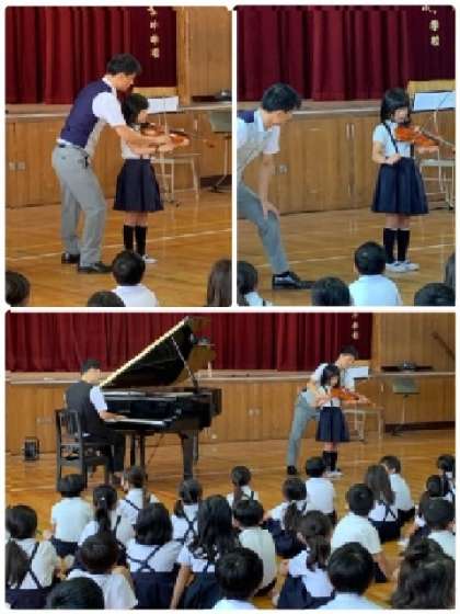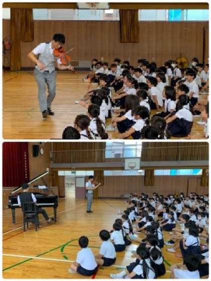 9月22日(金)、プロの方をお招きし、1〜4年生対象にコンサートをしていただきました。お招きしたのは、「EVERLY エバリー」さんです。「EVERLY エバリー」さんは、東京学芸大学音楽科を卒業した松尾兄弟が中心となって、2005年にプロ活動をスタート、日本全国でコンサートをしながら、テレビや新聞にも取り上げられているグループです。2015年に東京小金井市の観光大使にも選ばれ、東京オリンピック聖火式イベントでも演奏したそうです。今日は、九条北小学校の1〜4年生のために、「EVERLY エバリー」のメンバーの中でピアノとコーラスを担当する松尾悟郎さん、そして、バイオリンとヴォーカルを担当する松尾賛之さんが来てくれました。コンサートの中で、代表で1名の児童が、バイオリンの演奏も体験させていただきました。