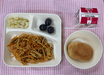 27日は「黒糖ロールパン、イタリアンスパゲッティ、キャベツのバジル風味サラダ、ぶどう(巨峰)、牛乳」でした。巨峰は甘く、旬を感じることができて好評でした。