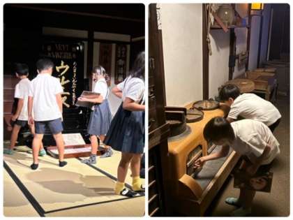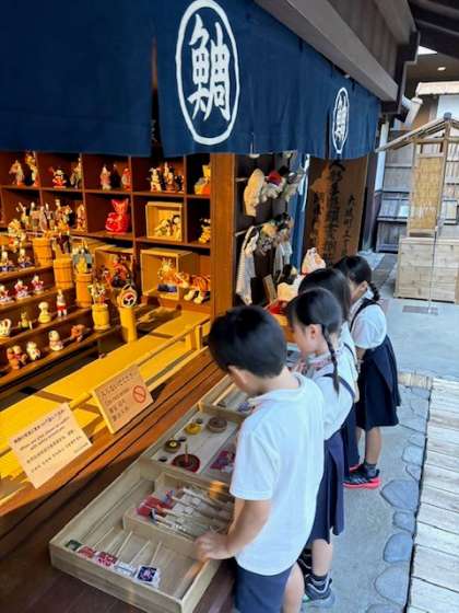 9階の展示室では、天保年間(1830年代)の大坂の町家を実物大で再現しています。まるでタイムスリップしたよう・・!200年の時空をさがのぼり、大坂の商家の賑わいや天神祭の飾りつけ、四季折々の年中行事、そして日々の暮らしを体感できます。3年生も、1つ1つを興味深く見ていました。