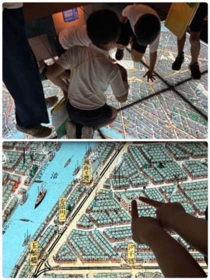 続いて、8階では、近代の大阪〜明治・大正・昭和の大阪のまち・住まいと暮らしを展示しています。中でも、対象13年の「大阪市パノラマ地図」が床一面に広がっているところでは、みんなが知っている場所を探しながら、楽しんでいました。