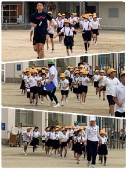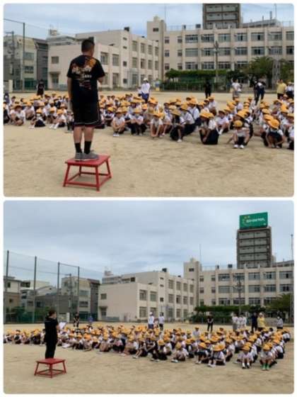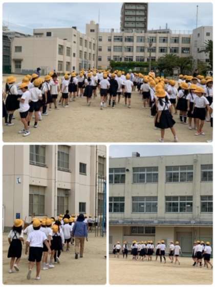 運動場に集合して、人数確認したところで、先生よりお話をしていただきました。お話の中では、「避難訓練の大切さについて」伝えてもらいました。「動物ものさし」の話もありました。そして、訓練は続きます。次は、津波の対応です。4階へすみやかに避難しました。ご家庭でも、「いざというときに避難する場所」などを相談しておいてください。