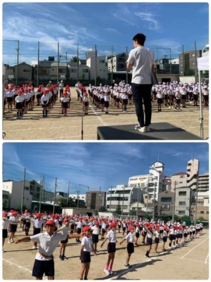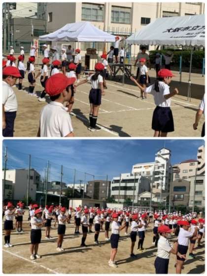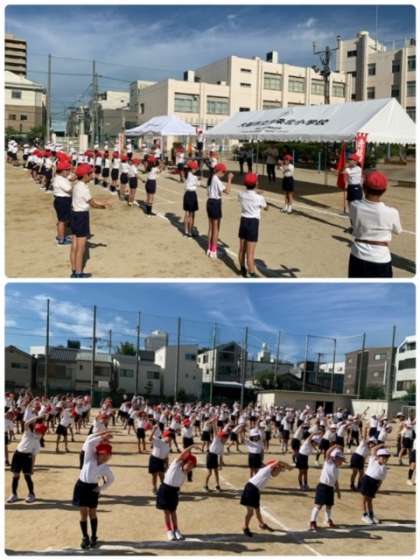 プログラム1番の全学年による「合同体操」の練習もしました。運動委員のメンバーが前に出て、模範の動きをしてくれています。