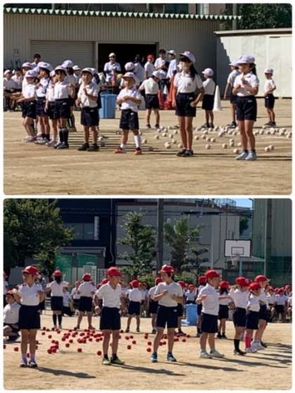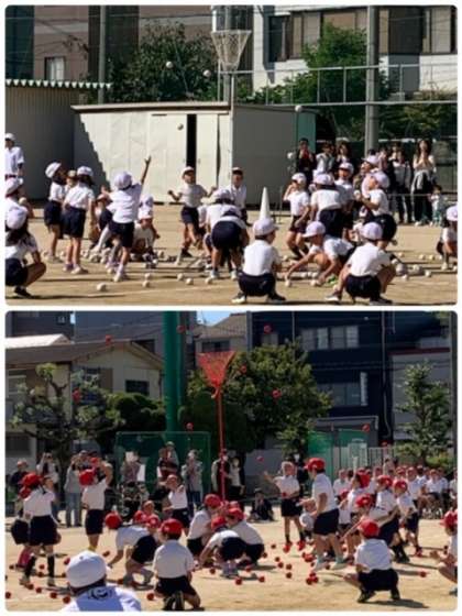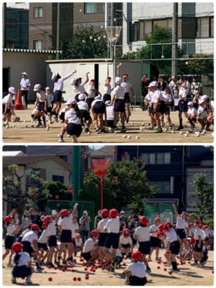 プログラム8番、低学年団体競技「☆スーパーマリオ玉入れ☆」です。1年生が「マリオ」に、2年生が「ルイージ」になって玉入れをします!