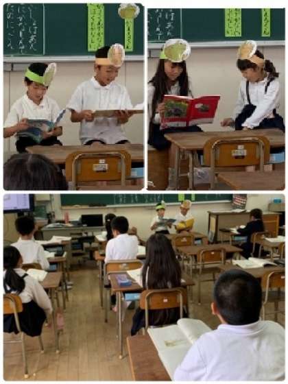それぞれが考えたことを、かえるくん役とがまくん役になって音読劇で表現しました。表情や口調なども工夫しながら発表していました。