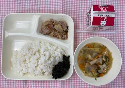 1日の給食は「ごはん、豚肉のスタミナ焼き、すまし汁、のりのつくだ煮、牛乳」でした。のりのつくだ煮は、きざみのり、しいたけの粗みじん、かつおぶしで作ります。教室で手づくりだと伝えると、みんなびっくりしていました。「手づくりなんや!すごい」「おいしいよ」など言いながら、ごはんと一緒にパクパク食べていました。