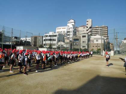 11月2日(木)、朝から晴天に恵まれました。今日は、全校遠足の日です。運動場に集まり、出発のつどいをしました。さあ、長居公園に向けて出発です!