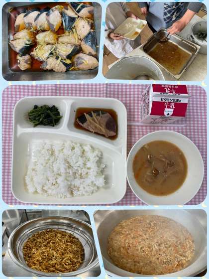 今日の給食は「ごはん、なまりぶしのしょうが煮、なめこのみそ汁、ほうれんそうのごまあえ、牛乳」でした。なまりぶしは、普段食べていないようで、「これなに?」と聞いてくる子がたくさんいました。「なまりぶしって言うよ」「もとはかつおっていう魚だよ」「かつおなんだ!」と何人かの子とやりとりしていると、「じゃあこれなに?」とおわんを指さして聞いてくる子が。「あぁ、これはなめこだよ」「これがなめこなんやぁ」つるんとした食感で好評でした。なまりぶしも食べ慣れない子が多かったのですが、よく食べてくれていました。