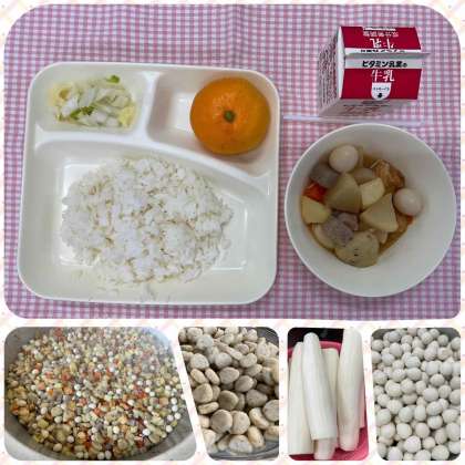 20日の給食は「ごはん、関東煮、はくさいの甘酢あえ、みかん、牛乳」でした。関東煮には、うずら卵が入っていて、当番が配膳する時に毎回みんなが数を気にしています。「何個入ってる?」「2個」「3個」「いいなぁ」などなど。今回は一口サイズのあつあげや、こんにゃく、ごぼう天などもあったので、いろいろなものについて「何個?」と聞きながら食べている様子も見られました。