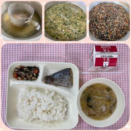 今日の給食は「ごはん、さごしのごまじょうゆかけ、うすくず汁、大豆の煮もの、牛乳」でした。うすくず汁は、最後にでんぷんでとろみをつけています。そのおかげで冷めにくく、あたたかい汁ものをいただくことができます。