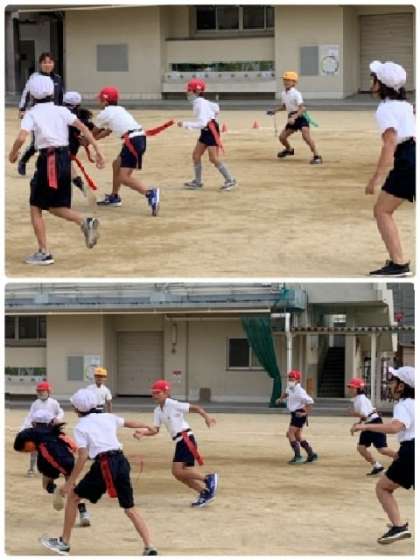 4年生の体育の時間です。タッチラグビーに取り組みました。楽しんで活動しています。