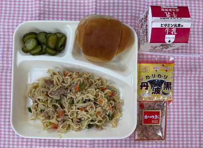 今日の給食は「黒糖ロールパン、和風焼きそば、きゅうりのしょうがづけ、いり黒豆、牛乳」でした。しょうゆ味の和風焼きそばは、食べる時に小袋のかつおぶしを自分でかけます。何人かの子が、全部かけずに残ったかつおぶしをそのまま食べようとしていて、「かつおぶしってそのままよりも、かけて食べた方がおいしいなぁ」と。確かにそうですね。そのままよりも、かけて食べた方が、焼きそばもかつおぶしもおいしかったかなと思います。