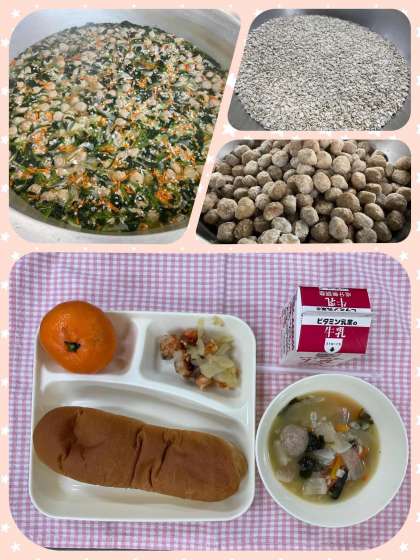 スープには、大人気の肉だんごと、プチプチ食感の押麦が入っていました。ほうれんそうの色合いもきれいで、やさしい味のスープでした。