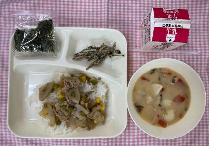 今日の献立は「れんこんのちらしずし、ぞう煮、ごまめ、牛乳」でした。今日は正月の行事献立です。ぞう煮のだしは、かつおぶしでとっています。白みそが多めのみそ仕立てで、金時にんじんの赤、みつばの緑がきれいでした。