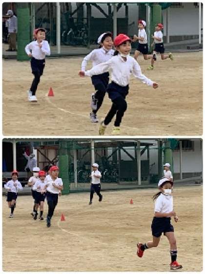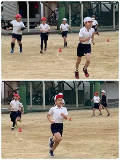 2年1組の体育の授業の様子です。授業の初めに、トラックを走っています。毎回、少しずつ距離を伸ばして・・・今日は、5周に挑戦しました。自分のペースで、しっかりとした走りを見せてくれました。