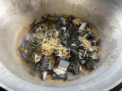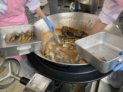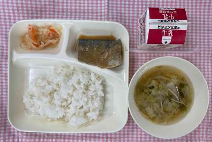 今日の給食は「ごはん、さばのみそ煮、すまし汁、紅白なます、牛乳」でした。みそ煮は釜にこんぶをしき、さばをならべて煮込んで仕上げています。大きな骨がたくさんありましたが、低学年も気をつけながら上手に食べていました。給食委員会のお昼の放送でも骨には気をつけるようお知らせしてくれました。骨は本当にたくさんあって、何人も子が見せてくれました。