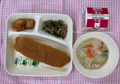 今日の給食は「コッペパン、はくさいのクリーム煮、あつあげのピリ辛じょうゆかけ、豚肉とさんどまめのオイスターソースいため、マーガリン、牛乳」でした。はくさいのクリーム煮は、クリームを加えてコクをプラス。中華スープの素も入っているので、うま味もありました。しかし、見た目はクリームシチューのようにも見え、なかなか中華風とは気づいてもらえませんでした。さんどまめもオイスターソースでいためて食べやすく。好評の献立でした。