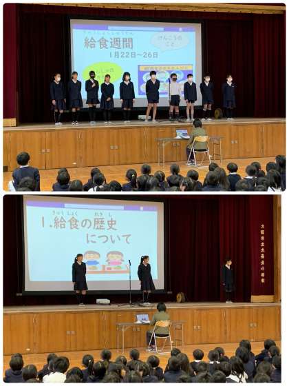 1月19日(金)の児童集会は、給食委員会による発表でした。1月22日〜26日は、九条北小学校の給食週間です。