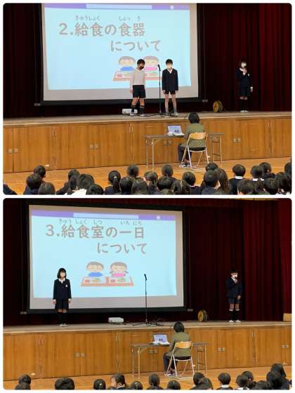 最初に、「給食の歴史」について発表してくれました。明治22年の初めての給食から始まって、今の給食まで、献立もいろいろ変わってきました。