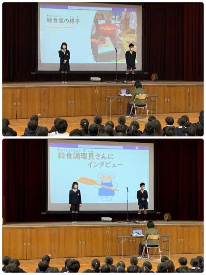 「給食室の一日」の紹介では、給食室の作業の様子や給食調理員さんへのインタビューの様子も紹介してくれました。インタビューの中で、「今日の給食おいしかった!」と言ってくれる時が、とてもうれしいとのお話がありました。